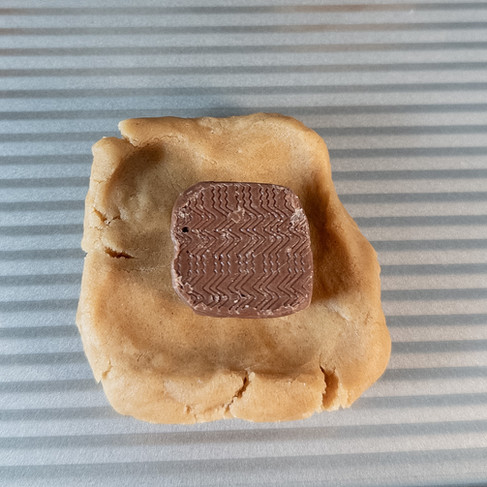 Above Left: Cookie dough rolled out and flatten. Above Right: Mini Snickers added.
