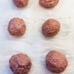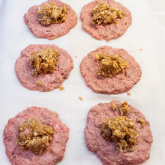 Above Left: ground beef and evaporated milk ready to combine. Above Middle: ground beef mixture flattened into six patties. Above Right (2 photos): prepared stuff mix added to meatballs and sealed.