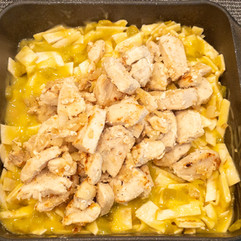 3. In a separate large bowl, combine soup, green chiles, and 1 cup of cheese and mix together. If this mixture is thicker then you prefer, add 2 tablespoons of milk. Pour the mixture on top of your tortilla strip. Add the cooked chicken and onion to the baking dish and stir until all ingredients are fully combined. Top with 1 cup of cheese and bake, uncovered, for 20-25 minutes in your preheated oven.Â